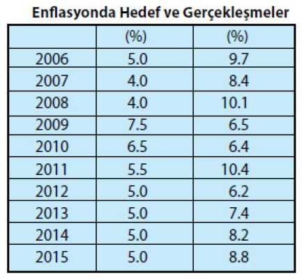 Merkez Bankası’nın enflasyon hedefindeki sapma, 2012 yılında yüzde 24 düzeyindeyken, 2013 yılında iki katına çıkarak yüzde 48’e çıktı. Merkez Bankası enflasyon hedefindeki sapma 2014 yılında yüzde 64’ü, 2015 yılında ise yüzde 76’yı buldu.