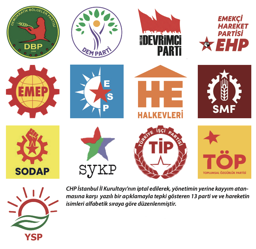 Beklenen ses yükseldi. Demokra- tik Bölgeler Partisi (DBP), Halkların Eşitlik ve Demokrasi Partisi (DEM Parti), Devrimci Parti, EMEP, ESP, EHP, SMF, SODAP, SYKP, TİP, TÖP, Yeşil Sol Parti ve Halk Evleri, CHP İstanbul İl Kurultayı’nın iptal edilerek, yönetimin yerine kayyum atanmasına karşı, şimdilik yazılı bir açıklamayla, güçlü bir tepki gösterdi. Bu parti ve hareketler, demokratik olarak yapılacak ilk seçimde seçmenin yüzde yirmilik oylarını temsil edeceği gibi, sokakta, grevlerde, serhildanlarda devlet terörüne karşı mücadelede muazzam bir deneye sahiptir. Bu bakımdan açıklama “sivil darbe” sürecine karşı büyük bir önem taşıyor.